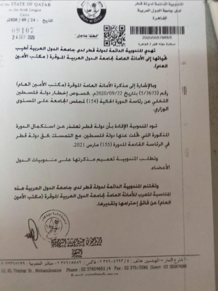 ونشر موقع "معا" الفلسطيني، كتاب بعثة قطر لدى الجامعة العربية، التي رفضت فيه تسلم رئاسة المجلس بعد اعتذار دولة فلسطين.