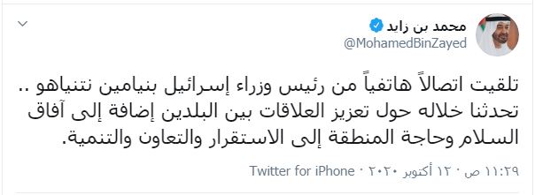 وكتب محمد بن زايد، في تغريدة على حسابه في تويتر "تلقيت اتصالاً هاتفياً من رئيس وزراء إسرائيل بنيامين نتنياهو؛ تحدثنا خلاله حول تعزيز العلاقات بين البلدين، إضافة إلى آفاق السلام وحاجة المنطقة إلى الاستقرار والتعاون والتنمية".