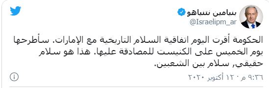 وغرد نتنياهو عبر "تويتر": "الحكومة أقرت اليوم اتفاقية السلام التاريخية مع الإمارات. سأطرحها يوم الخميس على الكنيست للمصادقة عليها".