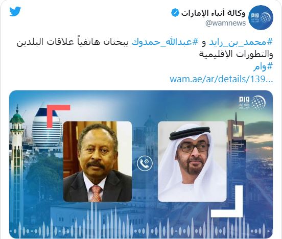 من جهته، قال مكتب رئيس الوزراء السوداني على "تويتر"، إن "محمد بن زايد" ومحمد بن راشد" أعربا عن دعمهما لجهود حكومة الفترة الانتقالية لتنفيذ اتفاقية السلام وتطوير العلاقات الثنائية بين السودان والإمارات بما يخدم مصلحة شعبي البلدين.
