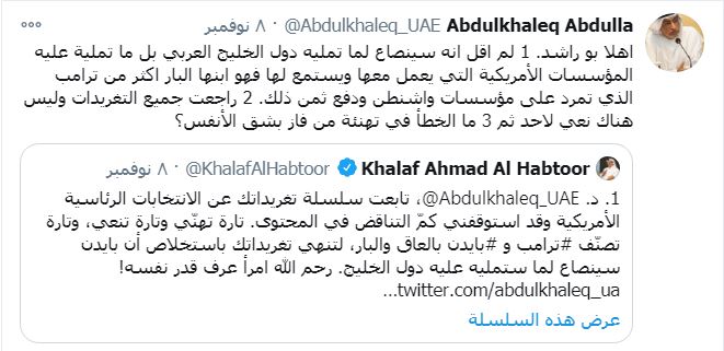 ورد عبدالخالق عبدالله على هجوم الحبتور بالقول: هلا بو راشد.. لم أقل أنه سينصاع لما تمليه دول الخليج العربي بل ما تملية عليه المؤسسات الأمريكية التي يعمل معها ويستمع لها فهو ابنها البار أكثر من ترامب الذي تمرد على مؤسسات واشنطن ودفع ثمن ذلك.