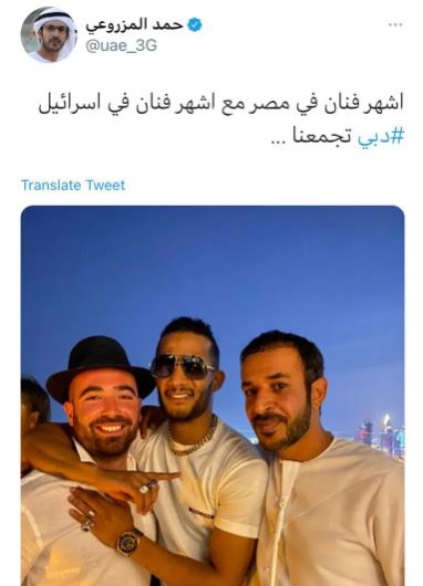 وكان المزروعي قد نشر صورة رمضان على حسابه الرسمي وعلق قائلا: " أشهر فنان مصري مع أشهر فنان إسرائيلي.. دبي تجمعنا"، وذلك قبل أن يحذف التغريدة بعد دقائق من نشرها.