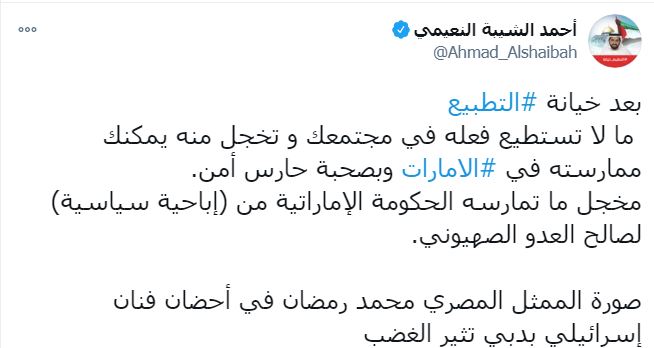 الإعلامي الإماراتي أحمد الشيبة النعيمي علق مستنكرا: ما لا تستطيع فعله في مجتمعك وتخجل منه، يمكنك ممارسته في #الامارات .. مضيفا: مخجل ما تمارسه الحكومة من "إباحية سياسية" لصالح العدو الصهيوني".