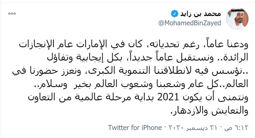 وقال ولي عهد أبوظبي عبر تويتر: "ودعنا عاماً، رغم تحدیاته، كان في الإمارات عام الإنجازات الرائدة.. ونستقبل عاماً جديداً، بكل إیجابیة وتفاؤل ..نؤسس فيه لانطلاقتنا التنمویة الكبرى، ونعزز حضورنا في العالم.. كل عام وشعبنا وشعوب العالم بخیر وسلام.. ونتمنى أن یكون 2021 بدایة مرحلة عالمیة من التعاون والتعايش والازدهار".
