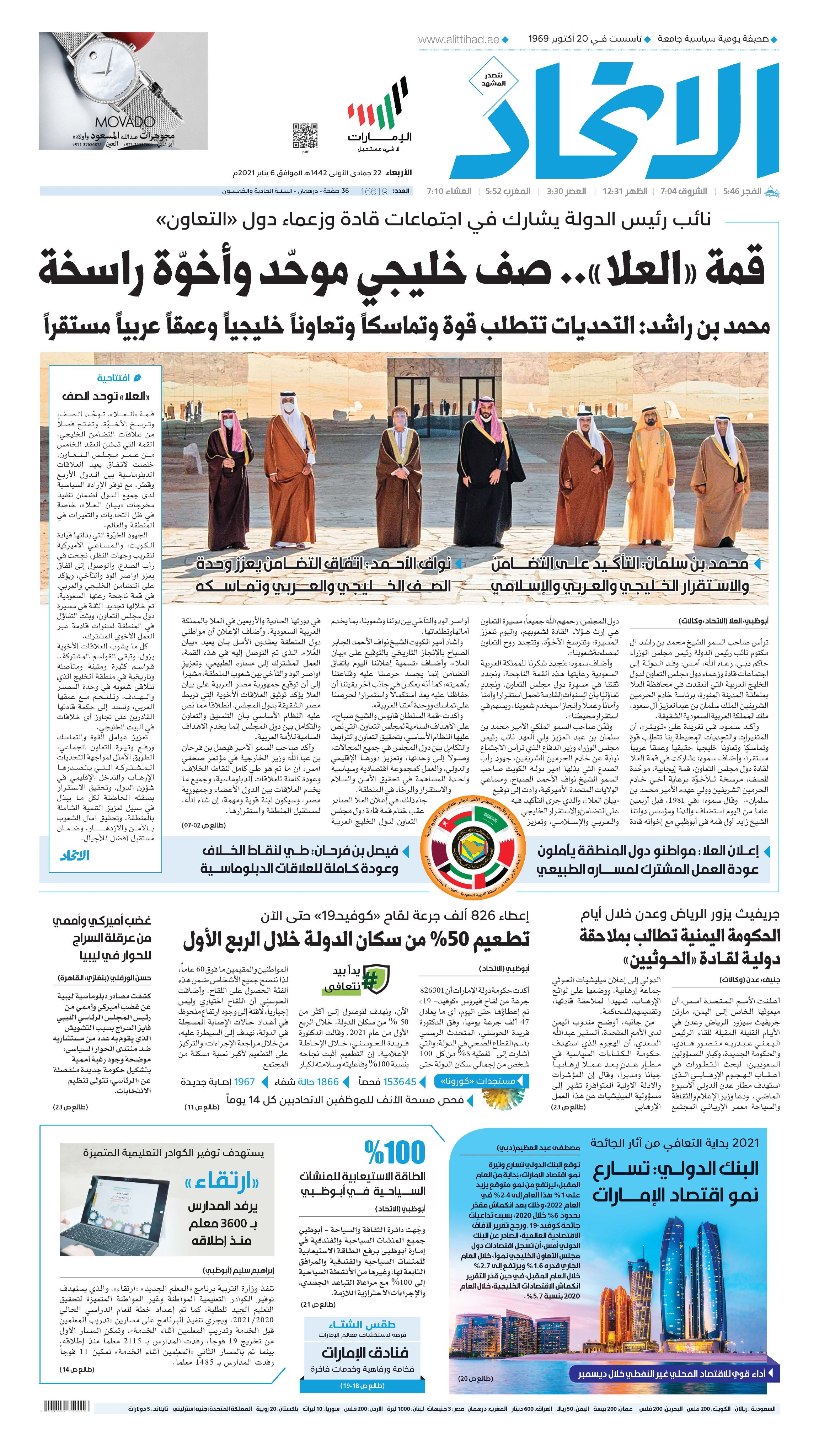 وإلى جانب كلمة الشيخ محمد بن راشد آل مكتوم، والذي اشتركت فيه جميع الصحف اليومية، كتبت صحيفة الاتحاد في افتتاحيتها عن أهمية القمة ودورها في تجسيد روح الأخوة والتعاضد الخليجي والتكامل في جميع المجالات، ونشرت صحيفة البيان تقريرا في الصفحة الأولى كتبه مراسلها في القاهرة حمل عنوان «العلا» توحد الصف.