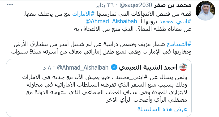 كشف الكاتب والإعلامي الإماراتي أحمد الشيبة النعيمي، جانباً من معاناة ابنه المعاق داخل الدولة، جراء استمرار منع السلطات الإماراتية لابنه من السفر للحاق بأسرته في بريطانيا، حيث يعاني ابنه "محمد" من شلل دماغي وبحاجة لرعاية خاصة.