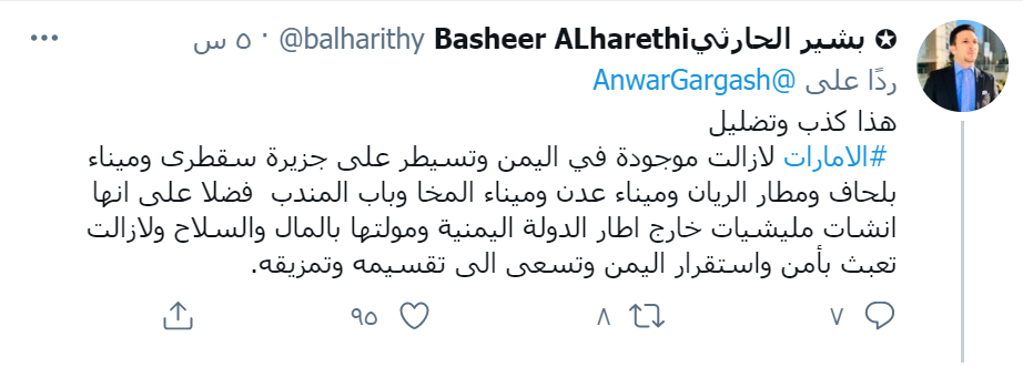 وقال الإعلامي اليمني بشير الحارثي، إن "هذا كذب وتضليل ..الامارات لازالت موجودة في اليمن وتسيطر على جزيرة سقطرى وميناء بلحاف ومطار الريان وميناء عدن وميناء المخا وباب المندب فضلا على انها انشات مليشيات خارج اطار الدولة اليمنية ومولتها بالمال والسلاح ولازالت تعبث بأمن واستقرار اليمن وتسعى الى تقسيمه وتمزيقه".