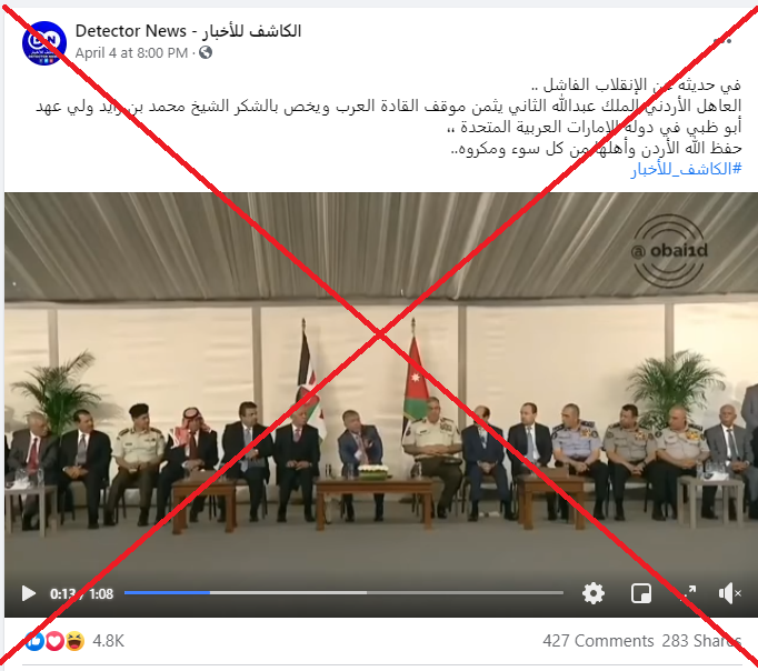 انتشر على مواقع التواصل الاجتماعي فيديو قيل إنه يظهر ملك الأردن عبد الله الثاني وهو يشكر ولي عهد أبوظبي الشيخ محمد بن زايد على دعمه في الأزمة التي حدثت داخل العائلة المالكة، حيث تشير المراجع إلى هذا الفيديو قديم ولا علاقة له بهذه التطورات.