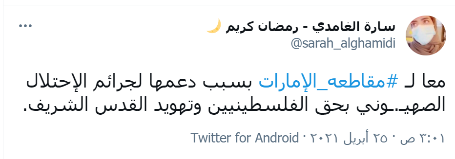 وكتبت سارة الغامدي على حسابها بـ"تويتر": معا لـ #مقاطعه_الإمارات بسبب دعمها لجرائم الإحتلال الصهيـوني بحق الفلسطينيين وتهويد القدس الشريف".