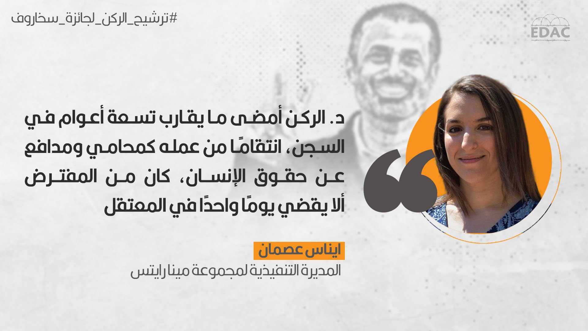 من جانبها، قالت المحامية والحقوقية إيناس عصمان والمديرة التنفيذية لمنظمة "منَا لحقوق الإنسان"، قالت هي الأخرى، إن الدكتور الركن أمضى ما يقارب في السجن انتقاماً من عمله كمحامي ومدافع عن حقوق الإنسان كان من المفترض أن لا يقضي يوماً واحداً في السجن".