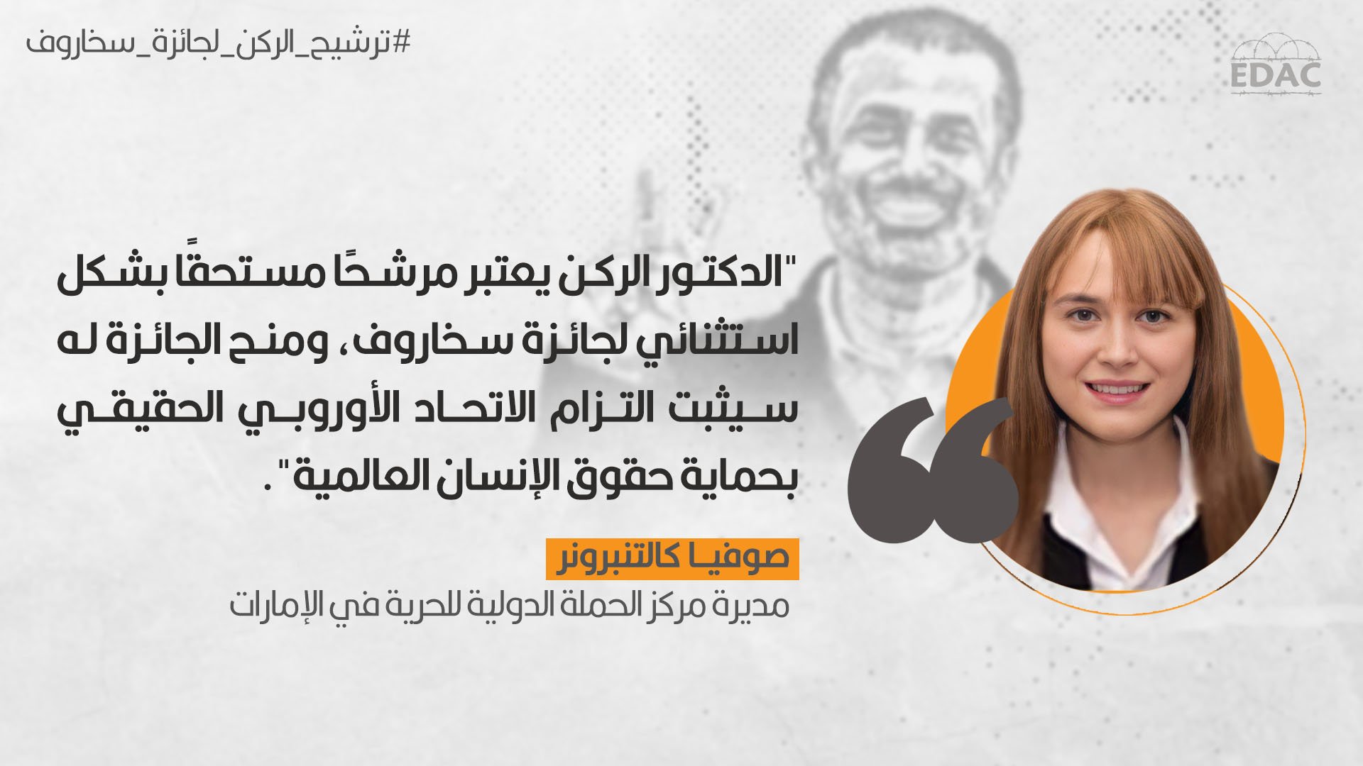 وأضافت أن "الدكتور الركن يعتبر مرشحاً مستحقاً بشكل استثنائي لجائزة سخاروف ومنح الجائزة له سيثبت التزام الاتحاد الأوروبي الحقيقي بحماية حقوق الإنسان العالمية.