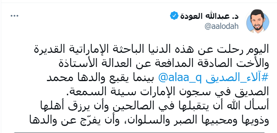 الكاتب والإعلامي الإماراتي أحمد الشيبة النعيمي، قد أعلن عن وفاة الباحثة الإماراتية آلاء الصديق في منفاها ببريطانيا، وهي ابنة معتقل الرأي في سجون أمن الدولة في أبوظبي محمد الصديق منذ 9 سنوات.