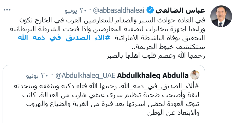 ورد الصحفي اليمني عباس الضالعي هو الآخر على تعليق عبدالخالق بالقول: في العادة حوادث السير والصدام للمعارضين العرب في الخارج تكون وراءها اجهزة مخابرات لتصفية المعارضين واذا فتحت الشرطة البريطانية التحقيق بوفاة الناشطة الاماراتية #آلاء_الصديق_في_ذمة_الله ستكتشف خيوط الجريمة".