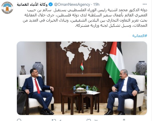ونقل "اشتية" رسالة خطية من الرئيس الفلسطيني محمود عباس إلى سلطان عُمان هيثم بن طارق تسلمها أسعد بن طارق آل سعيد، نائب رئيس الوزراء لشؤون العلاقات والتعاون الدولي والممثل الخاص للسلطان.