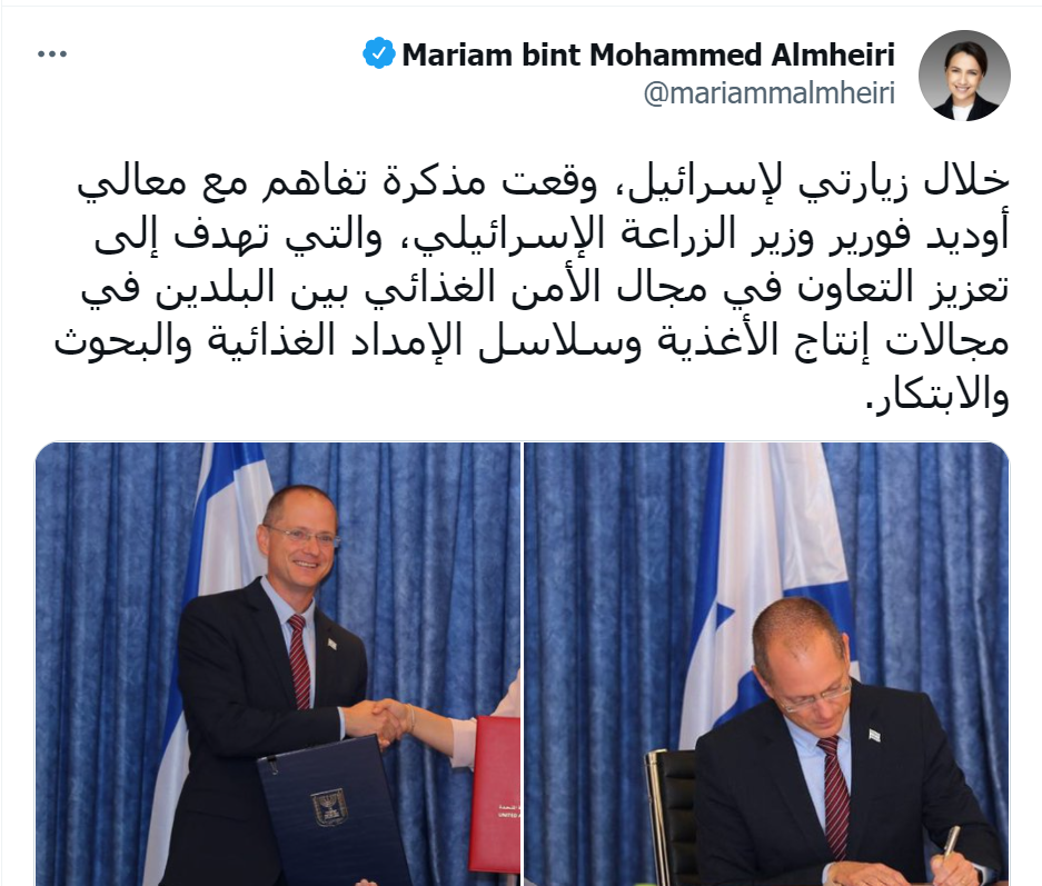 من جانبه، قال وزير الزراعة الإسرائيلي في تغريدة بحسابه على تويتر: "كان لي الشرف لاستضافة الوزيرة الإماراتية مريم المهيري والتوقيع معها على وثيقة تفاهمات للتعاون في مجال البحث والتطوير الزراعي والتجارة بين أبوظبي وتل أبيب".