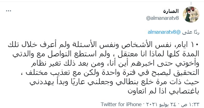 وأضاف: "استمر التحقيق بنفس الأسئلة تقريبا لعشرة أيام متواصلة يوميا لثلاث فترات، كل فترة محقق، والمحقق المسائي لا يسألني أي سؤال؛ فقط يجعلني واقفاً طول الوقت وأنا مرهق لم أنم، وكان كأنه يلعب على الكمبيوتر، وكان يرفض الحديث معي".