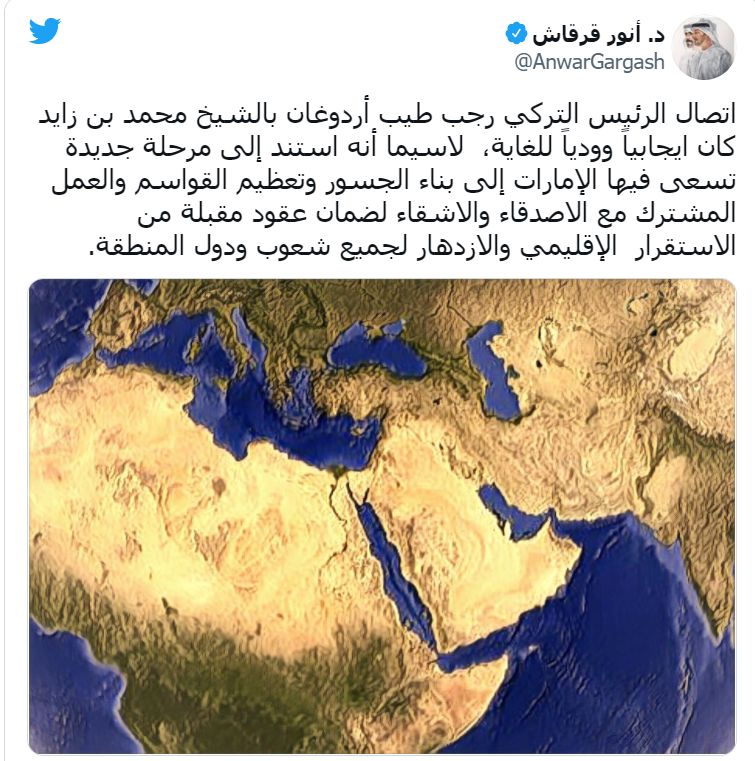 وكتب عبر حسابه على "تويتر": "اتصال الرئيس التركي رجب طيب أردوغان بالشيخ محمد بن زايد كان ايجابيا ووديا للغاية، لا سيما أنه استند إلى مرحلة جديدة تسعى فيها الإمارات إلى بناء الجسور وتعظيم القواسم والعمل المشترك مع الأصدقاء والأشقاء لضمان عقود مقبلة من الاستقرار الإقليمي والازدهار لجميع شعوب ودول المنطقة".