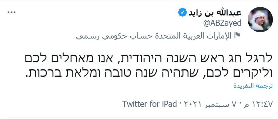 وقال عبدالله بن زايد في تغريدته التي كتبها بالعبرية: “بمناسبة عيد رأس السنة اليهودية، نتمنى لكم ولأحبائكم عاما جيدا وسعيدا”.