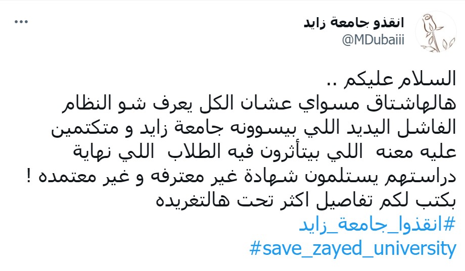 وبسبب هذا القرار، أطلق ناشطون إماراتيون وطلاب الجامعة، مساء الأربعاء، وسم #أنقذوا_جامعة_زايد للتعبير عن رفضهم لقرار الجامعة وأعضاء مجلس الجامعة الأحادي، تسليمها لكادر تعليمي أجنبي وترحيل الكادر الوطني منها.