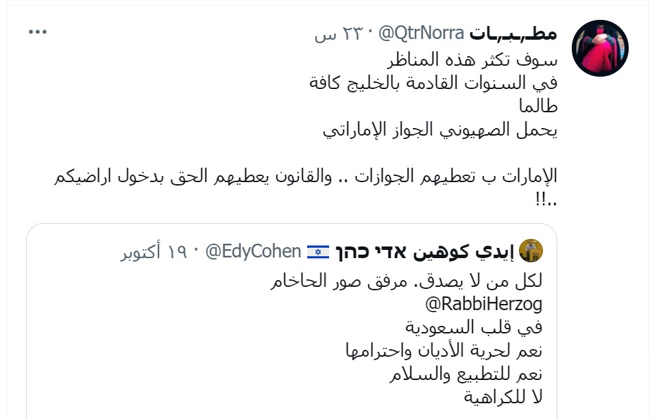 صاحب حساب "مطبات" قال إنه خلال السنوات القادمة بالخليج كافة سنرى مثل هذه العاهات يتجولون في عواصم دول الخليج طالما والصهيوني يحمل الجواز الإماراتي"، مشيراً إلى أن بوظبي تعطيهم الجوازات الإماراتية.. والقانون سوف يعطيهم الحق بالدخول لهذه الدول".