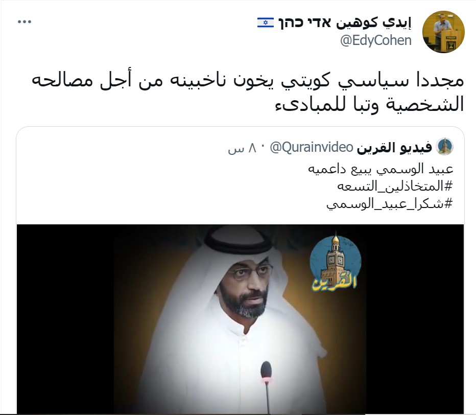 وشارك الصحفي الإسرائيلي فيديو لمنصة القرين التحريضية ضد النائب الوسمي، قائلاً: مجددا سياسي كويتي يخون ناخبينه من أجل مصالحه الشخصية وتبا للمبادئ" حد قوله.
