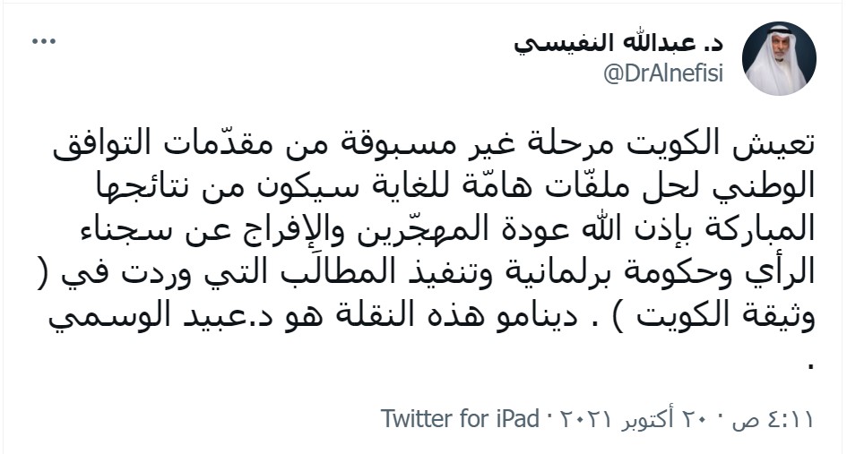 وقال النفيسي، الأربعاء، عبر حسابه على موقع التواصل الاجتماعي "تويتر": "تعيش الكويت مرحلة غير مسبوقة من مقدمات التوافق الوطني لحل ملفات هامة للغاية".