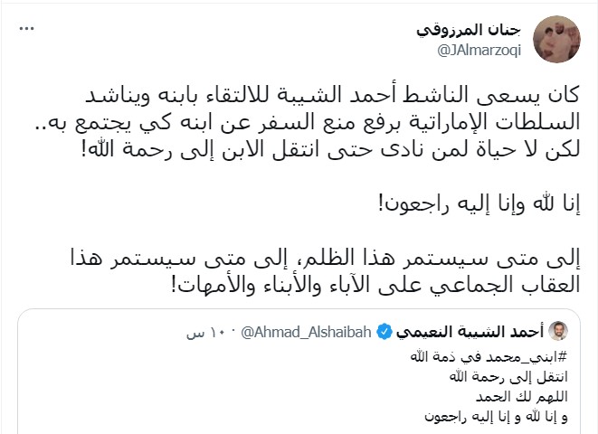 وكتبت جنان المرزوقي على صفحتها في تويتر: كان يسعى الناشط أحمد الشيبة للالتقاء بابنه ويناشد السلطات الإماراتية برفع منع السفر عن ابنه كي يجتمع به.. لكن لا حياة لمن نادى حتى انتقل الابن إلى رحمة الله.