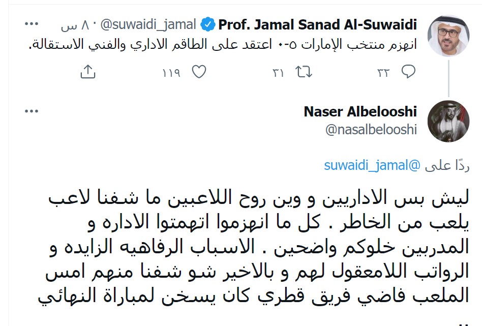 وقال جمال سند السويدي في تغريدة على حسابه بتويتر: انهزم منتخب الإمارات 5-0 اعتقد على الطاقم الاداري والفني الاستقالة".
