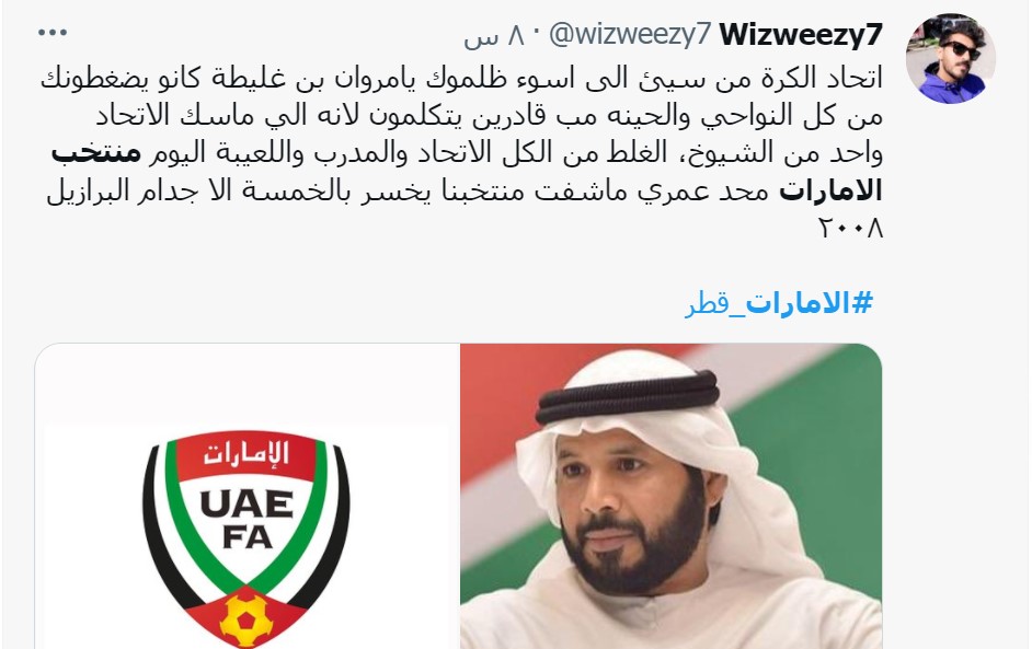 من جانبه، علق ناصر حسن الشيخ المدير السابق، للإدارة المالية في حكومة دبي، على هزيمة منتخب الإمارات بالقول: أفشل منتخب إمارتي منذ أن تأسست دولة الإتحاد.