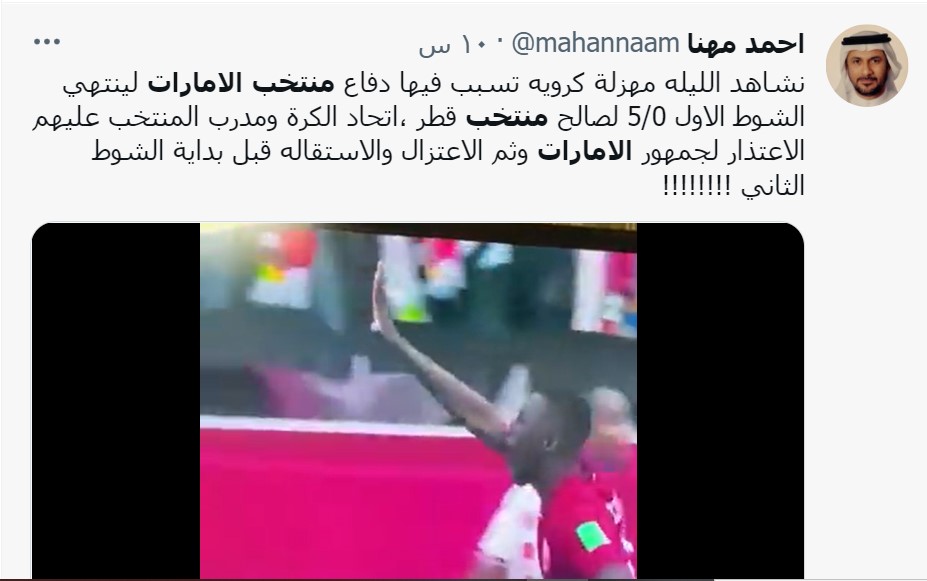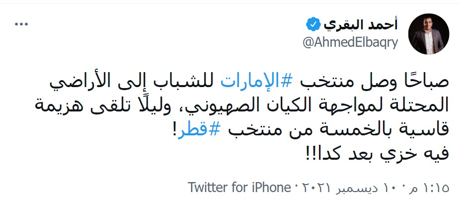 الصحفي المصري أحمد البقري سخر من هزيمة الإمارات أمام قطر بالقول: "صباحًا وصل منتخب الإمارات للشباب إلى الأراضي المحتلة لمواجهة الكيان الصهيوني، وليلًا تلقى هزيمة قاسية بالخمسة من منتخب قطر.