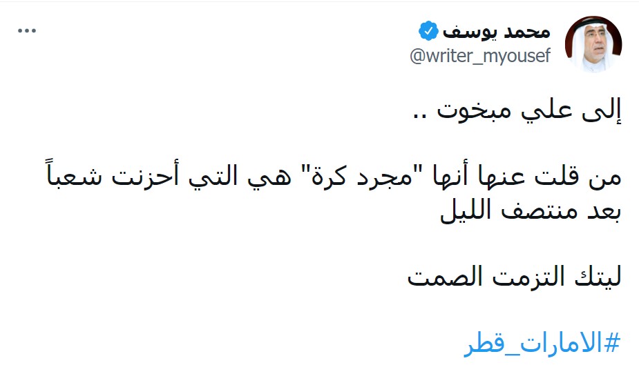 وقال الصحفي والكاتب الإماراتي محمد يوسف: إلى علي مبخوت.. من قلت عنها أنها "مجرد كرة" هي التي أحزنت شعباً بعد منتصف الليل ليتك التزمت الصمت".