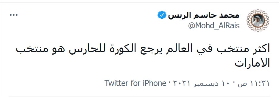 وسخر محمد جاسم الريس من هزيمة الأبيض أمام العنابي بالقول: " أكثر منتخب في العالم يرجع الكورة للحارس هو منتخب الإمارات".