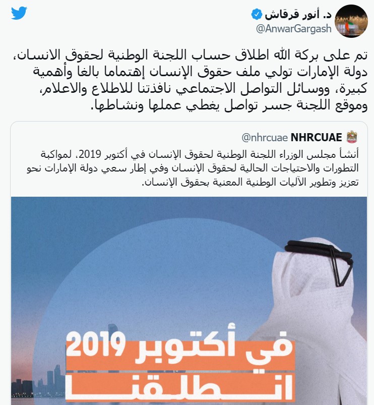 ففي عام 2019 أعلنت السلطات نيتها إنشاء "هيئة وطنية لحقوق الإنسان"، ولكن بدلاً من إنشاء هيئة وطنية قامت أبوظبي في أكتوبر 2019 بإنشاء "لجنة وطنية" برئاسة مستشار رئيس الدولة أنور قرقاش، في محاولة للالتفاف على المطالب الدولية بإنشاء مؤسسة وطنية حقوقية.