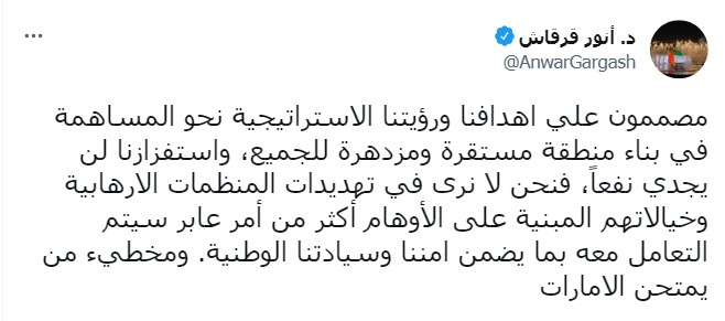 وتابع قرقاش: "نحن لا نرى في تهديدات المنظمات الإرهابية وخيالاتهم المبنية على الأوهام أكثر من أمر عابر سيتم التعامل معه بما يضمن امننا وسيادتنا الوطنية. ومخطئ من يمتحن الإمارات".