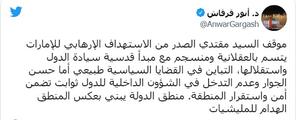 ووصف قرقاش في تغريدة على تويتر موقف الصدر بأنه يتسم بالعقلانية و"منسجم مع مبدأ قدسية سيادة الدول واستقلالها".