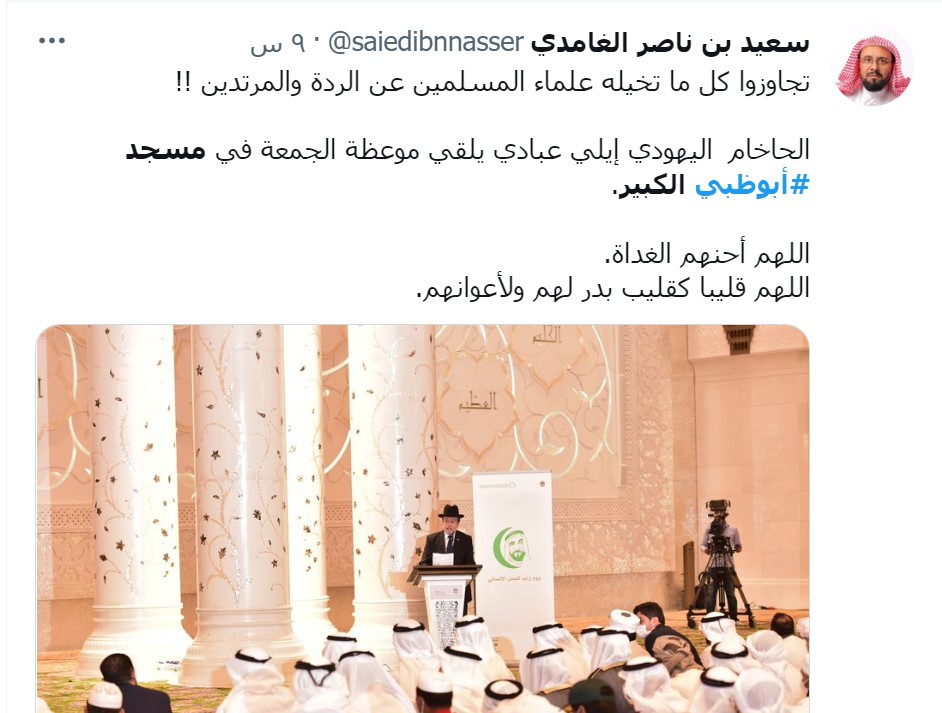 وقال الباحث والأكاديمي السعودي سعيد بن ناصر الغامدي "تجاوزوا كل ما تخيله علماء المسلمين عن الردة والمرتدين.. الحاخام اليهودي إيلي عبادي يلقي موعظة الجمعة في مسجد أبوظبي الكبير.. اللهم أحنهم الغداة. اللهم قليبا كقليب بدر لهم ولأعوانهم".