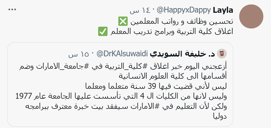 أما صاحب هذا الحساب " alrahbisafey" فكتب قائلاً: "خبر صادم جدا وعلى مستوى شخصي لأنها الكلية التي احتضنتني في أجمل أيام دراستي بجامعة الإمارات لا نسمع من الطلاب حين يتحدثون عن مهنهم المستقبلية عن مهنة المعلم كخيار لهم واعتقد ان الفكرة قد بنيت في مخيلتهم لما يرونه من معاناة المعلم وما يثقل كاهله".