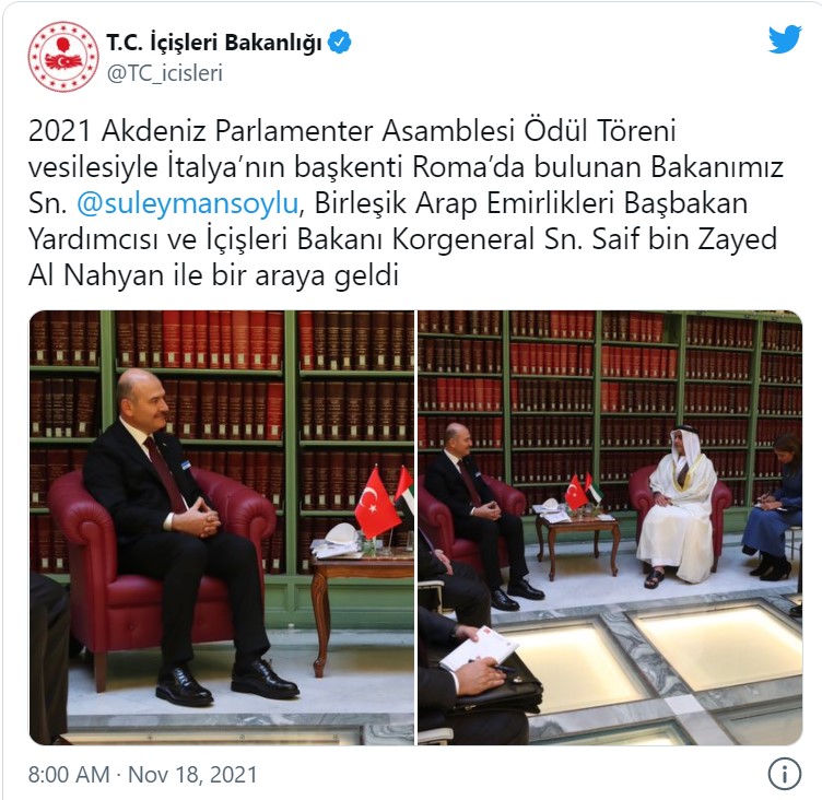 وقالت وزارة الداخلية التركية، في تغريدة، إن صويلو التقى وزير الداخلية ونائب رئيس الوزراء الإماراتي سيف بن زايد آل نهيان في روما" دون مزيد من التفاصيل حول اللقاء.