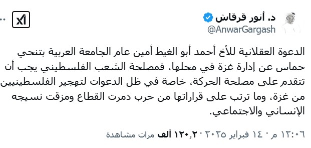 وأثنى قرقاش، في تدوينة على منصة "إكس"، على دعوة أبو الغيط، واصفاً إياها بأنها "دعوة عقلانية"، مشيراً إلى أن مصلحة الشعب الفلسطيني يجب أن تتقدم على مصلحة الحركة، خصوصاً في ظل دعوات التهجير.